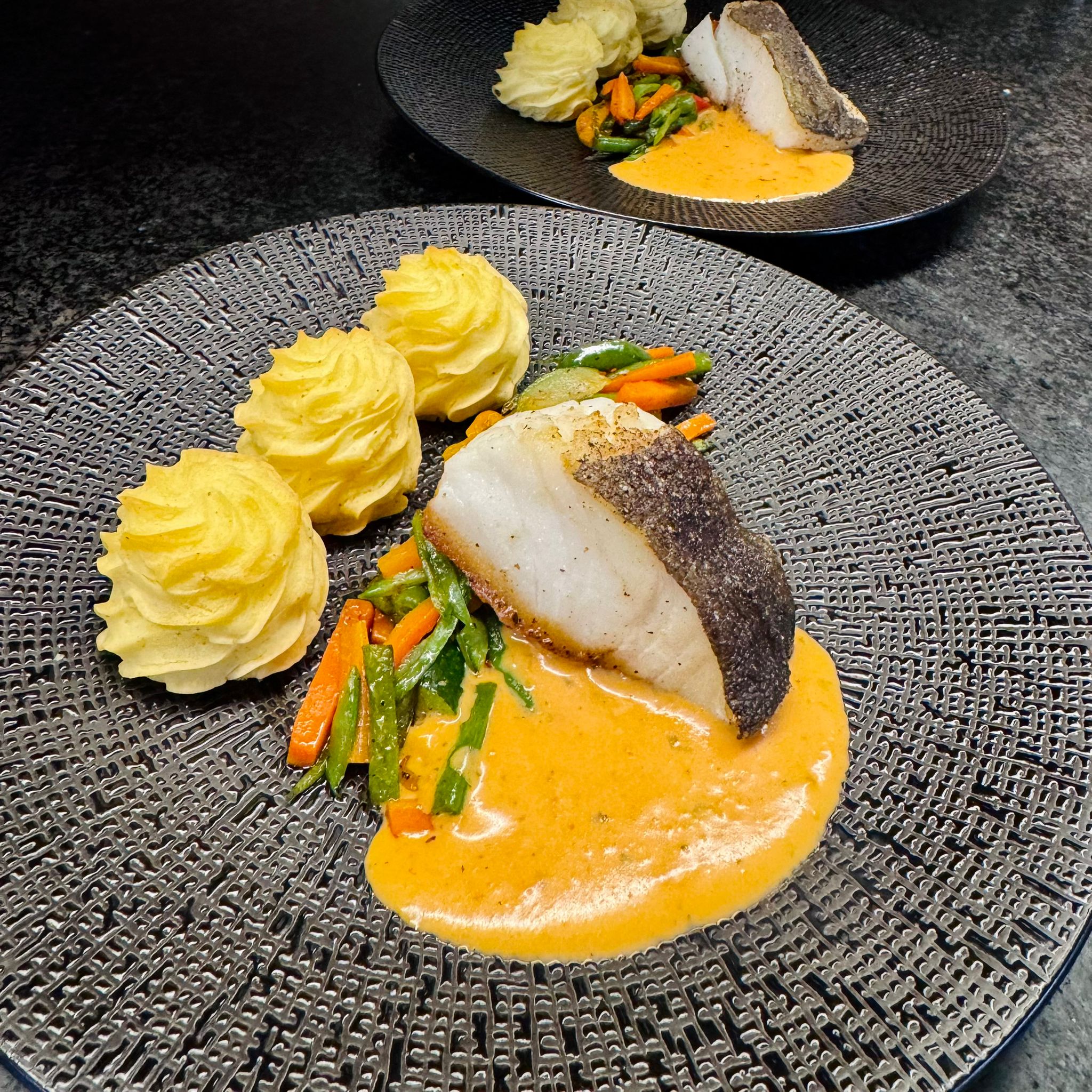 Kabeljauwhaasje met wokgroentjes, pommes duchesse en een mediterraans sausje