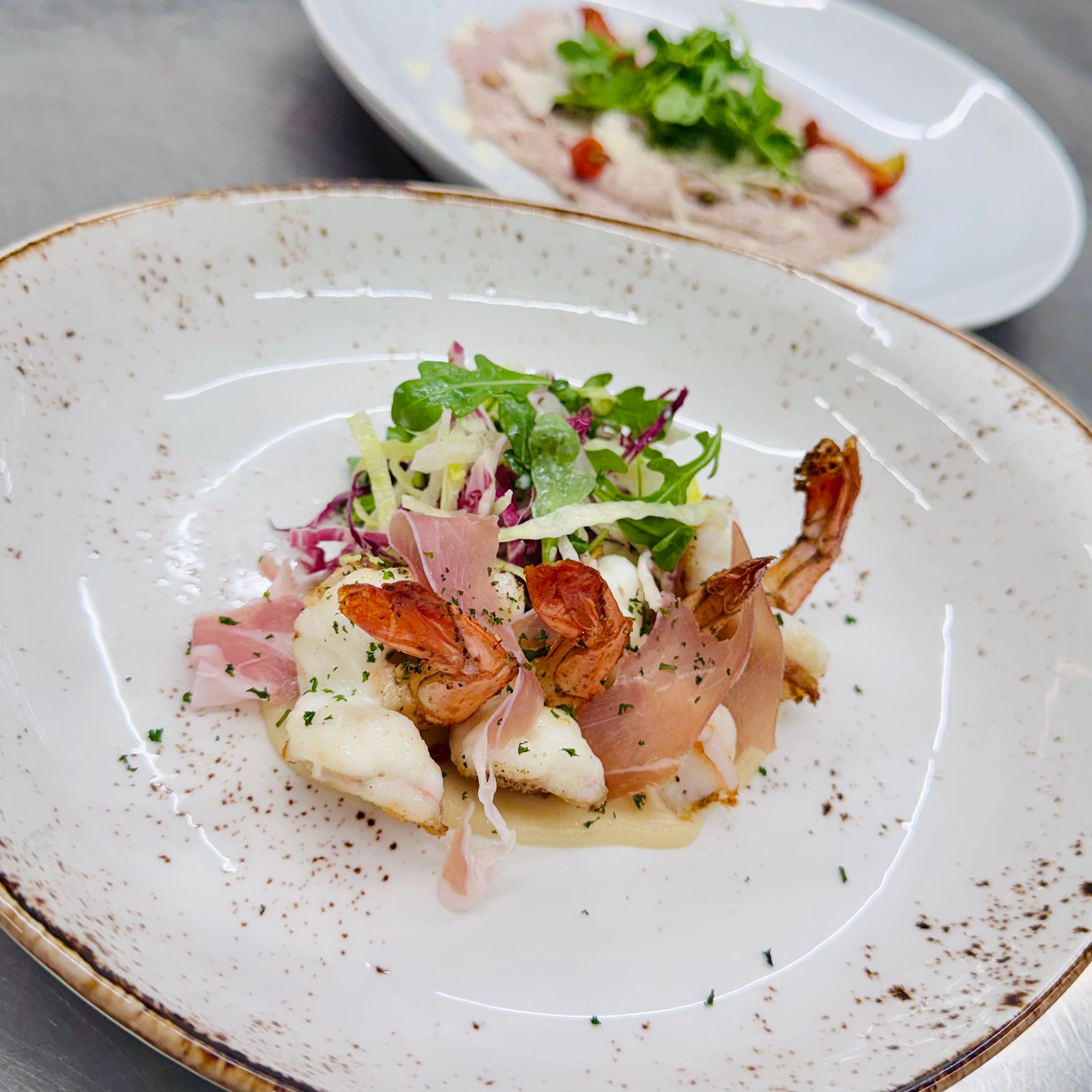 Salade met gebakken scampi’s, een crème van knolselder en gandaham
